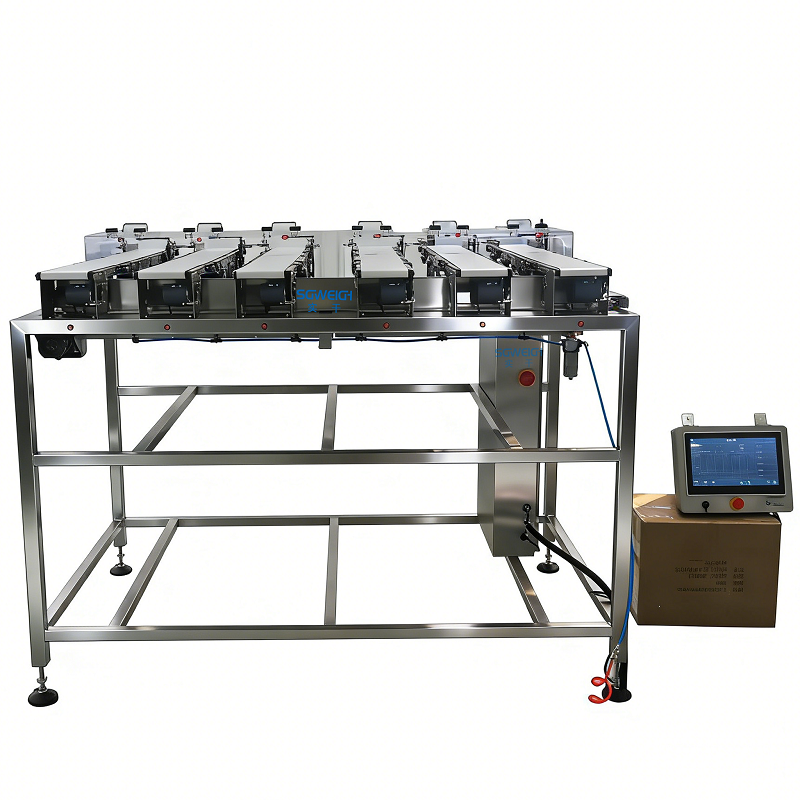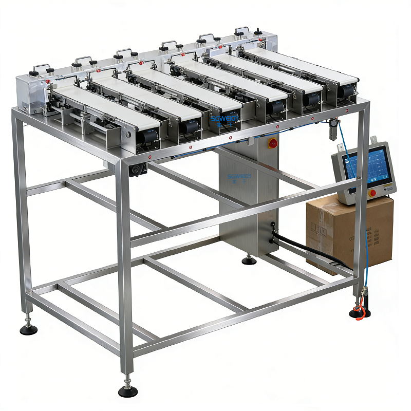 The High Speed Sachet 6 Lane Dynamic Check Weigher is an online dynamic weighing device used in high-speed, multi-channel production lines. It is suitable for 100% weight inspection of products with large production capacity, small specifications, or regular arrangement.The Multi-Line Stick Packs Weight Checker operates synchronously through six independent weighing channels, achieving accurate judgment and automatic rejection of product weights without reducing production line speed.
