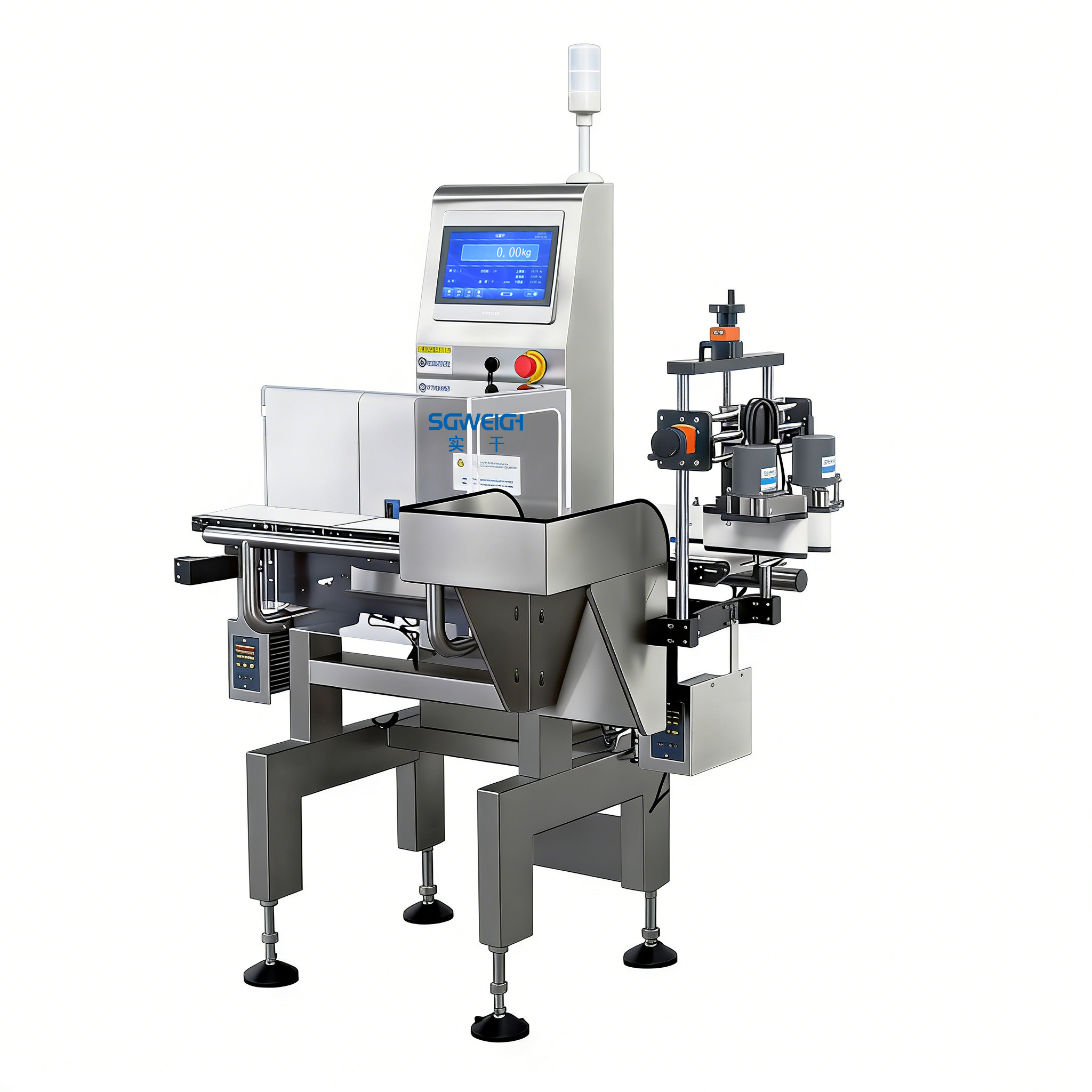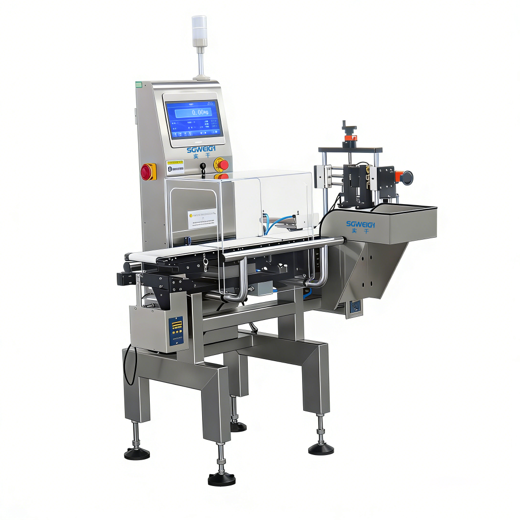 Automatically identifies over-weight, under-weight, unqualified filling volume and missing bottle defects, equipped with optional air blast, push rod or flap rejection mechanisms to separate unqualified products without line stop.